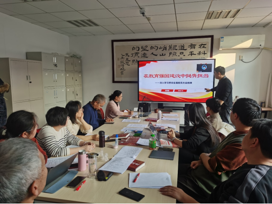 段光鹏指出,习近平总书记在全国教育大会上的重要讲话,对新时代教育事业取得的历史性成就、发生的格局性变化给予充分肯定,站在党和国家事业长远发展的战略高度,对新时代新征程建设什么样的教育强国、怎样建设教育强国作出深刻阐释和全面部署,是指导新时代新征程教育工作的纲领性文献,为建设中国特色社会主义教育强国提供了根本遵循和行动指南。教研室全体党员要认真学习、深刻领会习近平总书记重要讲话精神,把思想和行动统一到习近平总书记重要讲话精神和党中央决策部署上来,牢记使命、挺膺担当,为建设教育强国贡献力量。要坚持不懈用习近平新时代中国特色社会主义思想铸魂育人,坚持思政课建设与党的创新理论武装同步推进,不断提高思政课的针对性和吸引力,努力培养更多担当民族复兴大任的时代新人。