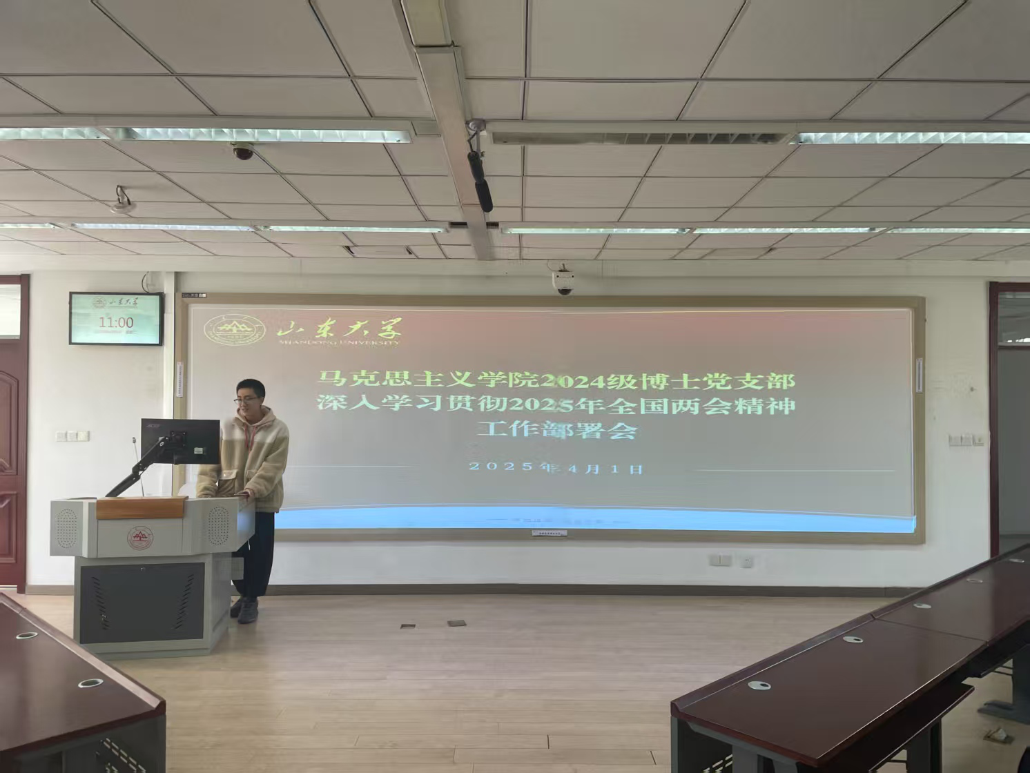 本次党日活动以“学习2025年全国两会精神”为主题,围绕2025年全国两会概况、习近平总书记重要讲话精神、2024年工作回顾、2025年工作总体部署等几项关键议题进行了理论解读和主题宣讲。段昀辉首先说明了2025年全国两会对于全国各族人民在党的领导下奋进中国式现代化新征程具有重大而深远的意义,重点回顾了2024年党和国家在经济运行、民生保障、产业发展、创新能力、生态环境、改革开放等领域的新成就与新突破,详细介绍了2025年党和国家在经济增长目标、扩大内需、科技创新、产业升级、乡村振兴与区域协调发展、民生改善、生态环保、改革开放等方面的发展计划与战略安排,并呼吁广大学生党员高举旗帜、凝心聚力、求真务实,主动朝着强国建设、民族复兴的宏伟目标奋勇前进。活动最后,学生党员们纷纷表示要深入贯彻落实2025年全国两会精神,勠力同心、团结奋进,主动为中国式现代化注入新活力与新动力。