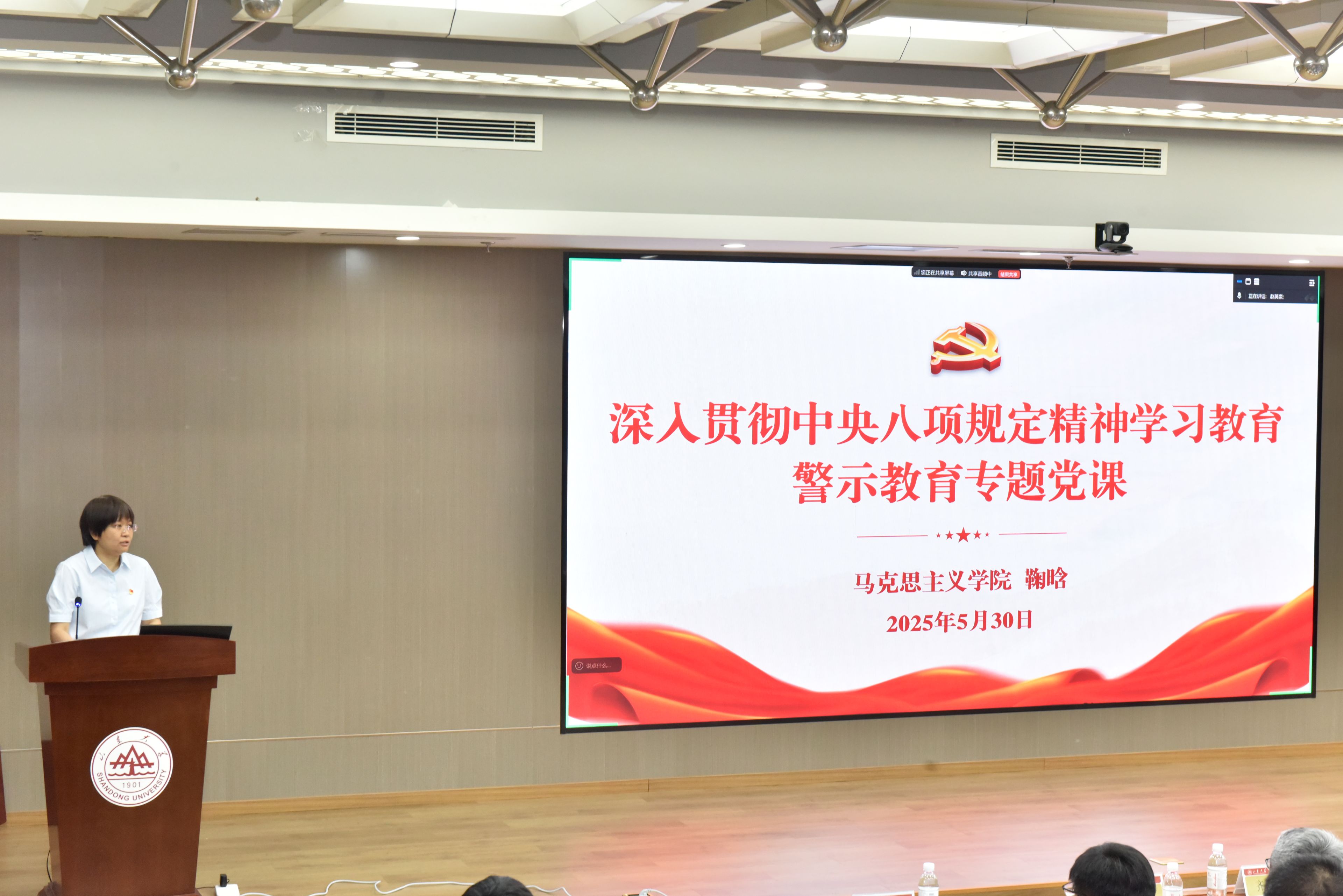 鞠晗列举了违反中央八项规定及其实施细则精神的问题清单,对照清单深入讲解了近年来高等教育系统特别是本领域的典型案例。通过详细阐述事件经过、处理结果以及造成的恶劣影响,深刻剖析案件发生的原因和教训,引导全体教职工深刻反思、警钟长鸣,切实从中受警醒、明底线、知敬畏。