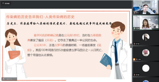来自基础医学院的纪兆蔚同学分享了《医学的温度》。她从人类传染病的历史、人类与传染病做斗争的历史及历史启示,以及新冠疫情传染病的现状入手,对于传染病进行了详细的介绍。王佳目同学表示了赞同,并表示新冠疫情应全球同心同德,共同防护,维护人类的尊严;陈嘉坤同学也对于新冠疫情的医护人员现状表示了关注;梁宇嘉同学从自己的专业出发进行了提问,抒发了自己的思考;李婧同学就“早发现、早诊断、早治疗”从癌症的角度发问;李源同学从医学教育人文关怀欠缺的方面,以及针对如何处理医患纠纷提出了自己的困惑。纪兆蔚同学对以上问题都一一作出了详细的回答,杜老师也在最后做了一个升华总结。