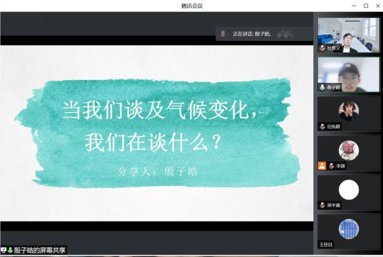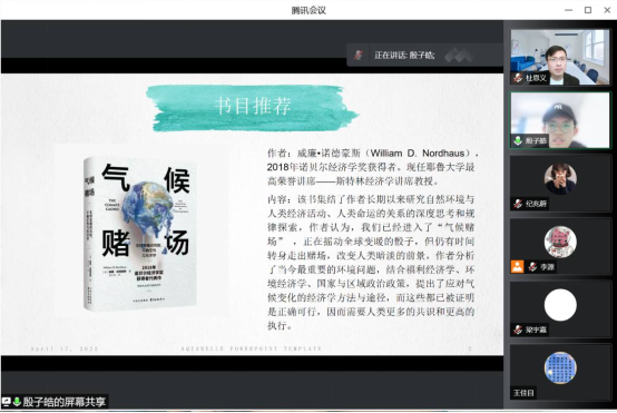 来自外国语学院的殷子皓同学分享了《气候赌场》这本书。他从“什么是气候变化”、“气候变化与我们的关系”与“气候变化与中国行动”三个角度阐述了全球极端天气和全球变暖的严重问题,并呼吁我们从自身做起,积极开展低碳生活。孙瑞同学就书中内容和殷子皓的观点表示了赞同,并且表示青马应作出积极带头作用;杜老师也分享了自己的经历和感受;任旭萍同学提出环保问题也是一个经济问题,询问了该如何以经济手段促进环保;张敬驰同学从政治和文化教育方面提出如何在环保领域发出“中国声音”;最后,祝铭旋同学立足后疫情时代,对环保的未来提出预测。殷子皓同学对以上问题都一一作出了精彩的回答。