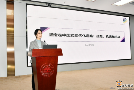 江小涓教授以“坚定走中国式现代化道路:蕴意、机遇和挑战”为主题,结合大量数据和生动案例,围绕“新征程新起点:经济社会发展取得巨大成就”“建设社会主义现代化国家:新高度新机遇新挑战”“坚定推进中国式现代化:立足国情和目标抓住机遇跨越挑战”“推进改革与开放,增强现代化建设新动能”“培养适应现代化建设新要求的高水平人才”五个方面展开,对中国式现代化进行了全面深度的解读。