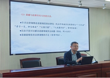 蔡卫忠教授围绕法治建设专题进行授课。蔡老师指出,随着我国改革开放逐步深化,关于法律与社会治理的讨论再次成为社会热点。依法治国与以德治国相结合,是我国社会治理的重要原则。