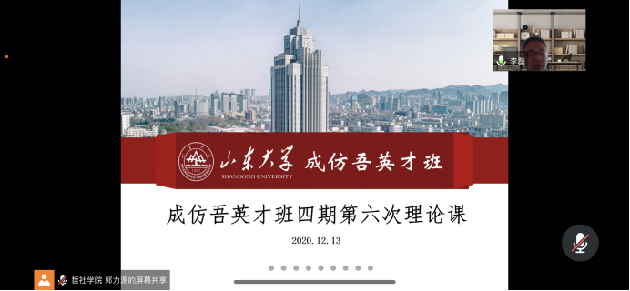 12月13日上午,williamhill中文齐鲁医院重症医学科副主任医师郭海鹏医生应邀在腾讯会议上为成仿吾英才班四期学员做专题讲座,郭海鹏医生是哈佛大学博士后,泰山学者青年专家,齐鲁医院杰出青年人才,中华医学会重症医学青年研究奖获得者,山东省第五批援鄂医疗队队员,医学世家五代传承。讲座由成仿吾英才班四期班主任李磊老师主持,成仿吾英才班四期全体学员参加了本次专题讲座。