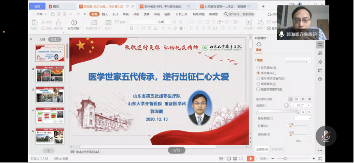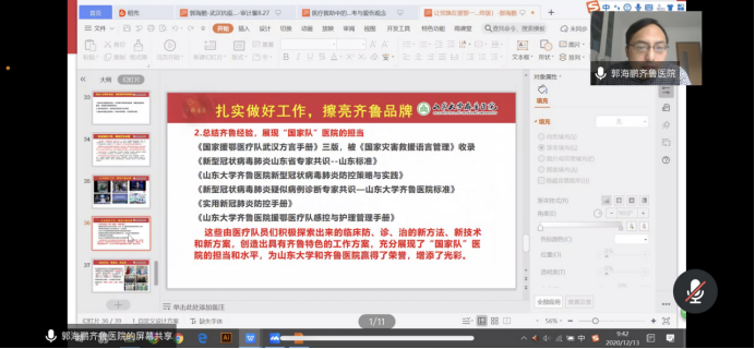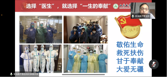 郭老师指出,习近平总书记曾提到“一定要把人民群众生命安全和身体健康放在第一位”。在齐鲁医院医疗队援鄂期间,无数医务人员以身体力行的担当精神,将个人的生命安全抛诸脑后,将个人的私人情绪埋在心中,把自己最好的一面留给患者,践行着大医仁爱的无私奉献。接下来,郭老师向我们介绍了齐鲁医院作为国家援鄂医疗队,严格执行国家标准,并带领制定护理手册、诊疗标准等多项临床诊治规范。此外,齐鲁医院通过视频连线等方式积极参与抗疫经验分享交流会,并得到多次国家级、省级新闻报道。