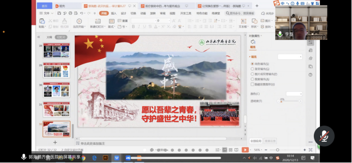 “愿以吾辈之青春,护卫这盛世之中华”。在疫情防控过程中,党员充分发挥先进堡垒作用,让党旗在援鄂一线高高飘扬。在此部分,郭老师从共产党员的政治觉悟、责任担当、党性修养以及党员医护人员的天使情怀四部分出发,为同学们展现了在此次严峻医疗卫生事件考验中,中国共产党员的奉献与担当。齐鲁医院援鄂医疗队抵达目的地的当天成立了临时党支部,将理论学习作为切入点,紧抓党员干部的思想政治教育工作,增强了党员医者的使命感、紧迫感和职责感,号召党员同志“亮身份、做表率、见行动、聚力量,坚决打赢抗疫阻击战”,不畏生死,冲锋在前。面对医护人手不足、医疗物资匮乏等情况,一线医生积极应对现实问题,进行病区的调整与分化,加强病房防护,完善清洁区改造,重视感染控制与医疗人员防护,建立三级查房制度等,医务工作者都尽自己的努力不断改进,尽全力做到最好。在抗疫期间,党员同志们更是率先进入传染病房,充分发挥党员的先锋作用,带头制定医疗队伍的高标准诊治要求,“零感染,零死亡,零回头”,齐鲁担当,齐鲁精神,齐鲁力量,值得我们每个人骄傲。