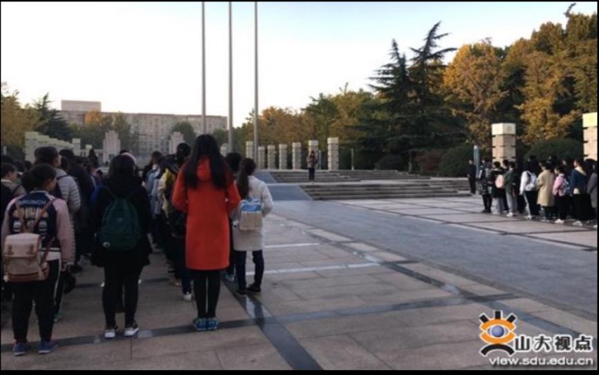 秋风微冷,天朗气清。国旗班列队旗杆前,身着墨绿军服,站得笔挺,目光坚定。晨雾初散的大成广场上还没有学生,只有一位晨练的爷爷在旗杆前站定,默默等待升旗仪式的开始。高中时学校是级部轮流在周一早上举行升旗仪式,所以整个三年只参加过一次而已。没想到大学的自己能再有幸参加一次升旗仪式,并且再次作为学生代表发言。陆续来临的同学们列队站好,国旗班跨着整齐的步伐行至旗杆之下,坚毅浑厚的国歌声里,国旗慢慢升至旗杆顶端。蔚蓝色的高空里,只一抹红在随风飘扬。