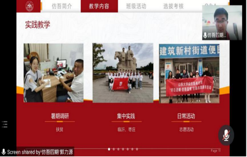 5月30日晚,成仿吾英才班四期学员面向全体报名学员开展五期学员招募线上宣讲活动。仿吾班四期班长郭力源进行主讲,并与其他四期学员一道为同学们云端答疑。郭力源从班级简介、教学内容、班级活动、选拔考核等方面对仿吾班五期学员招募作了细致的讲解,系统介绍了仿吾班在马克思主义基本理论学习和实践技能培育的特色亮点。答疑环节,四期学员解答了报名条件、学分置换等同学们普遍关心的问题。