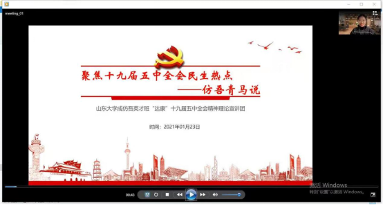 1月23日晚上7:30,williamhill中文成仿吾英才班“达康”宣讲队通过腾讯会议就十九届五中全会中的民生热点问题进行了理论宣讲,宣讲对象为队员联系到的中学的学弟学妹及家长和相关企业的员工等,共计近百人参与了本次线上的学习。宣讲气氛热烈,反响良好,宣传面较广,影响力较大。