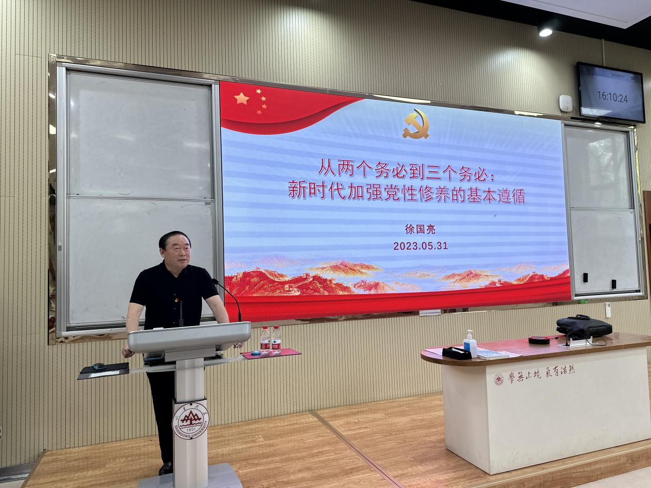 徐国亮教授从“三个务必”提出的背景出发,详细分析了由“两个务必”到“三个务必”的历史背景及现实背景,指出“三个务必”是对“两个务必”的一脉相承和发展升华,是习近平总书记对历史方位、面临形势任务、党情发展变化进行深刻分析作出的重大论断。徐国亮教授认为“三个务必”具有丰富的新时代意蕴及逻辑周密的内在关系,体现了认识论和方法论的高度统一。讲座最后,徐国亮教授从党性修养的具体定义入手,强调党员同志必须进一步提高政治站位,切实增强“四个意识”、坚定“四个自信”,坚决捍卫“两个确立”,不断提高政治判断力、政治领悟力、政治执行力。