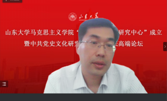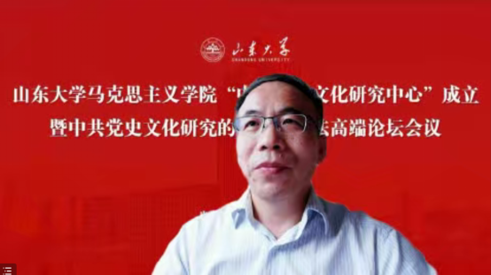 中共山东省委党史研究室原副主任、研究中心学术顾问丁龙嘉教授表示,研究中心是一个为同仁从思想文化的维度深入研究中共百年历史而搭建的一个学术研究平台,其学术研究的视野是新文科建设的视野,其学术研究的方向是立足山东、面向全国,旨在通过系统化探究,把握历史发展大势,发挥党史文化引领时代精神的功能。他以《思想文化的激荡、变迁与共产党的创建——以山东为例》为题作了主题发言,详细分析了从1860年到1922年的62年间,山东思想文化经历了中、西思想文化的激荡、变迁和中、西、马思想文化的初步激荡、变迁。