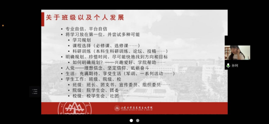 在经验分享环节,学院2018级优秀毕业生焉祯和孙珂从不同的角度为新生解答了关于学习与生活的各项疑惑,对新生提出了许多宝贵的建议,并对同学们提出了鼓励。