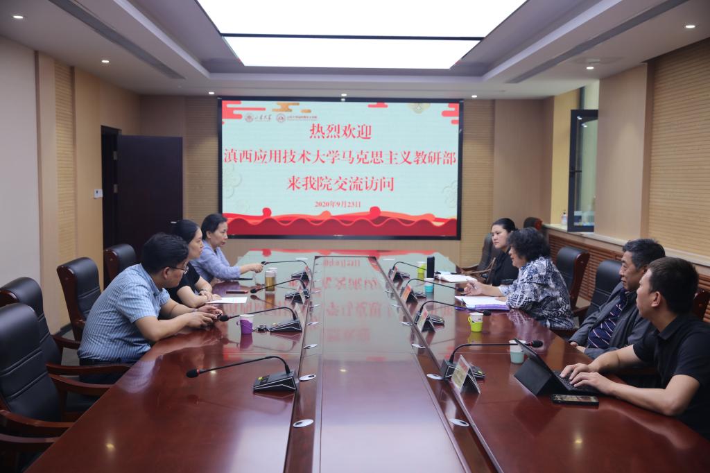 9月23日上午,滇西应用技术大学马克思主义教研部负责人冯波一行来我院就思政课教学和科研等问题进行交流访问。学院党委书记马晓琳、副院长郑敬斌、副处级组织员齐子萍参加座谈。