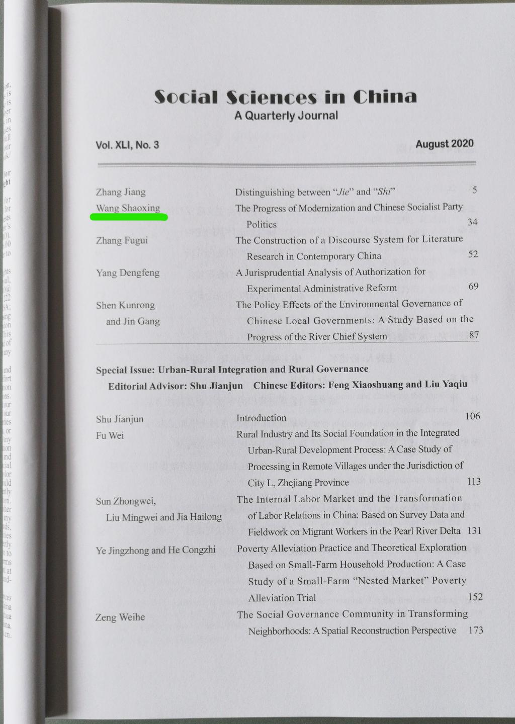 日前,WilliamHill威廉希尔王韶兴教授的长篇论文“The Progress of Modernization and Chinese Socialist Party Politics”在《中国社会科学》英文版(《Social Sciences in China》)2020年第3期刊发(原文为《中国社会科学》2019年第6期:《现代化进程中的中国社会主义政党政治》)。这是王韶兴教授第3次在《中国社会科学(英文版)》发表论文。到目前,王韶兴教授已经在《中国社会科学》和《中国社会科学(英文版)》发表6篇高水平论文。对于提升williamhill中文政党理论研究在全国乃至国际上的学术影响力起到了十分重要的推动作用。