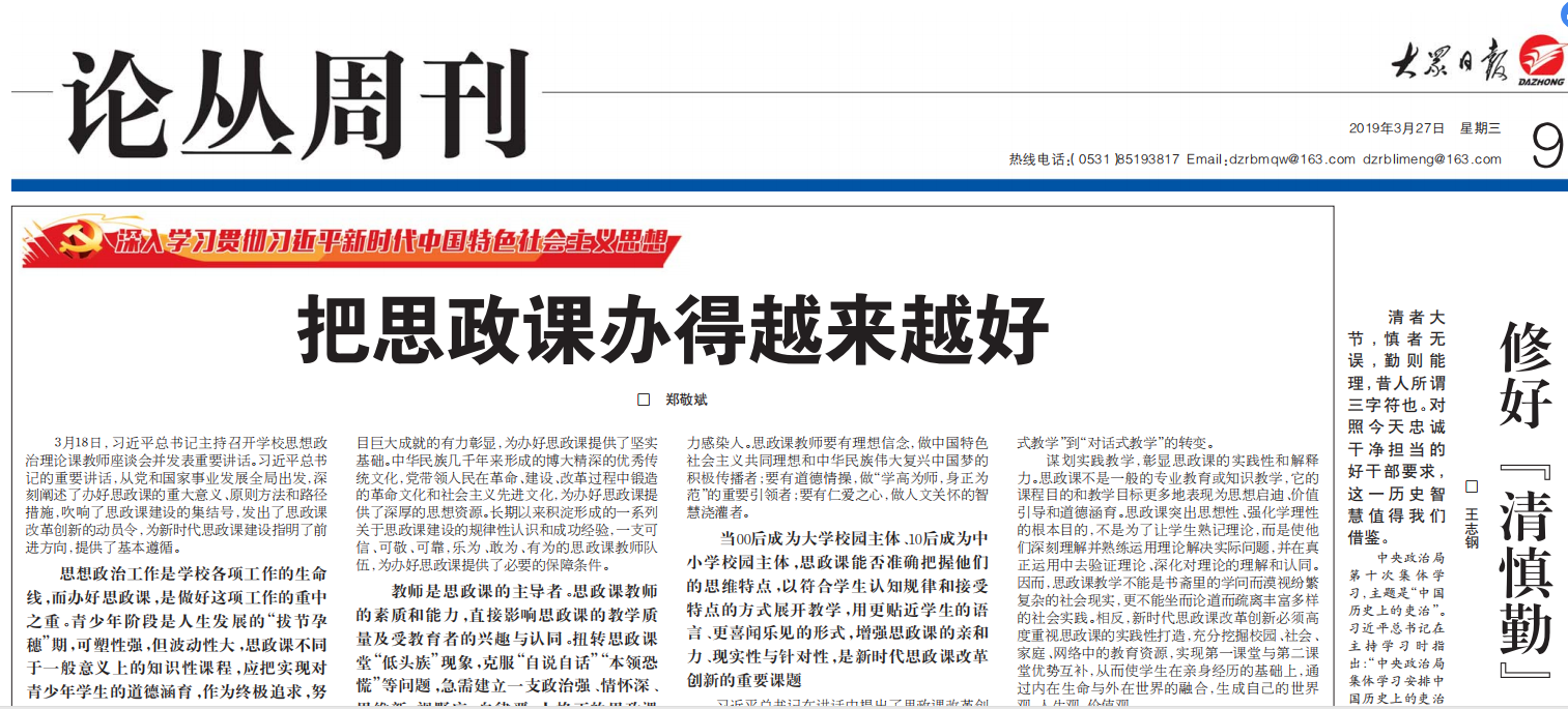 习近平总书记主持召开的学校思政课座谈会,是新时代办好思政课的里程碑式会议。落实总书记重要讲话精神,推动思政课教学科学化、规范化,构建协同育人的思政课建设大格局,对促进青少年人生成长重要一课“立起来”“活起来”“兴起来”,具有重要的现实意义和长远意义。