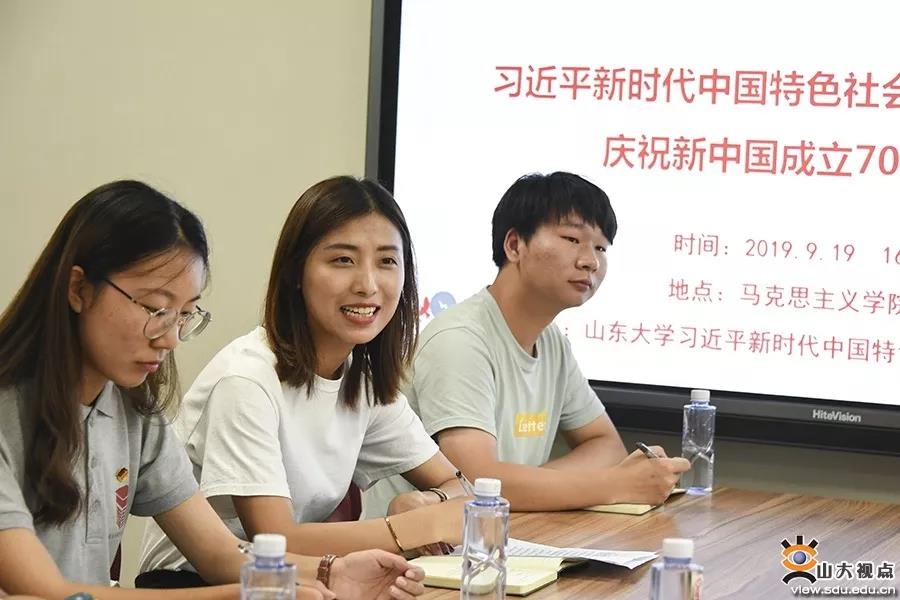 活动伊始,与会成员集体观看了“庆祝新中国70周年”微视频《70年岁月如歌》。随后,六位来自不同年级、不同专业的同学围绕“结合新中国成立70年取得的历史性成就,谈如何深化"只有中国特色社会主义才能发展中国的理论认识"和"结合学习习近平新时代中国特色社会主义思想,谈如何增强做合格社会主义建设者和接班人的思想自觉和行动自觉"两个话题,分别论述了中国共产党何以带领中国走向世界舞台中央、运用融媒体促进习近平新时代中国特色社会主义思想武装当代大学生头脑的方式方法、中国特色社会主义的优势、如何立足马克思主义理论专业做合格社会主义建设者和接班人、新中国成立及改革开放带来的巨大变化、社会主义文化的优越性和走中国道路的重要意义。