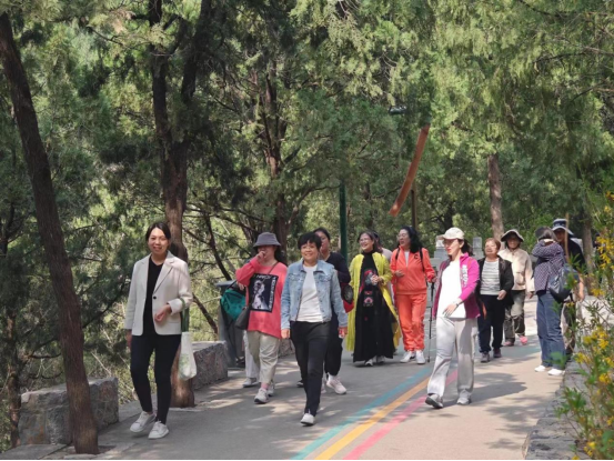 春季的佛慧山峻峭挺拔,树木葱茏,绿意盎然,连翘花海犹如金色瀑布挂在山间,北宋时期开凿的摩崖巨佛头像历经千年风雨依然雄伟壮观,佛慧山的自然景观与人文历史底蕴交织在一起。参加教师从景区北门出发,沿环山步道向上,在暖阳微风、鸟语花香中观花赏春、交流情感、开阔胸襟;在国动初心长廊前以节点打卡形式完成本次佛慧山环山徒步行活动。