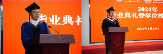 2020级本科毕业生代表李修源、2021级研究生毕业生代表张文金先后发言。李修源代表全体本科毕业生向母校和学院的培养表示感谢。他表示要继续以饱满的热情迎接人生的机遇与挑战,以青春之姿昂然之姿、奋斗之姿,在大有可为的时代大有作为,时刻准备为中国式现代化挺膺担当、为发展马克思主义理论作出原创性贡献。张文金深情回忆了自己硕士生涯的点点滴滴,表达了对母校的眷恋和不舍,以及对未来的信心和决心。他鼓励同学要以“厚重朴实、明理求真”的态度对待精彩人生,不惧未来艰险,祝愿大家前程似锦。