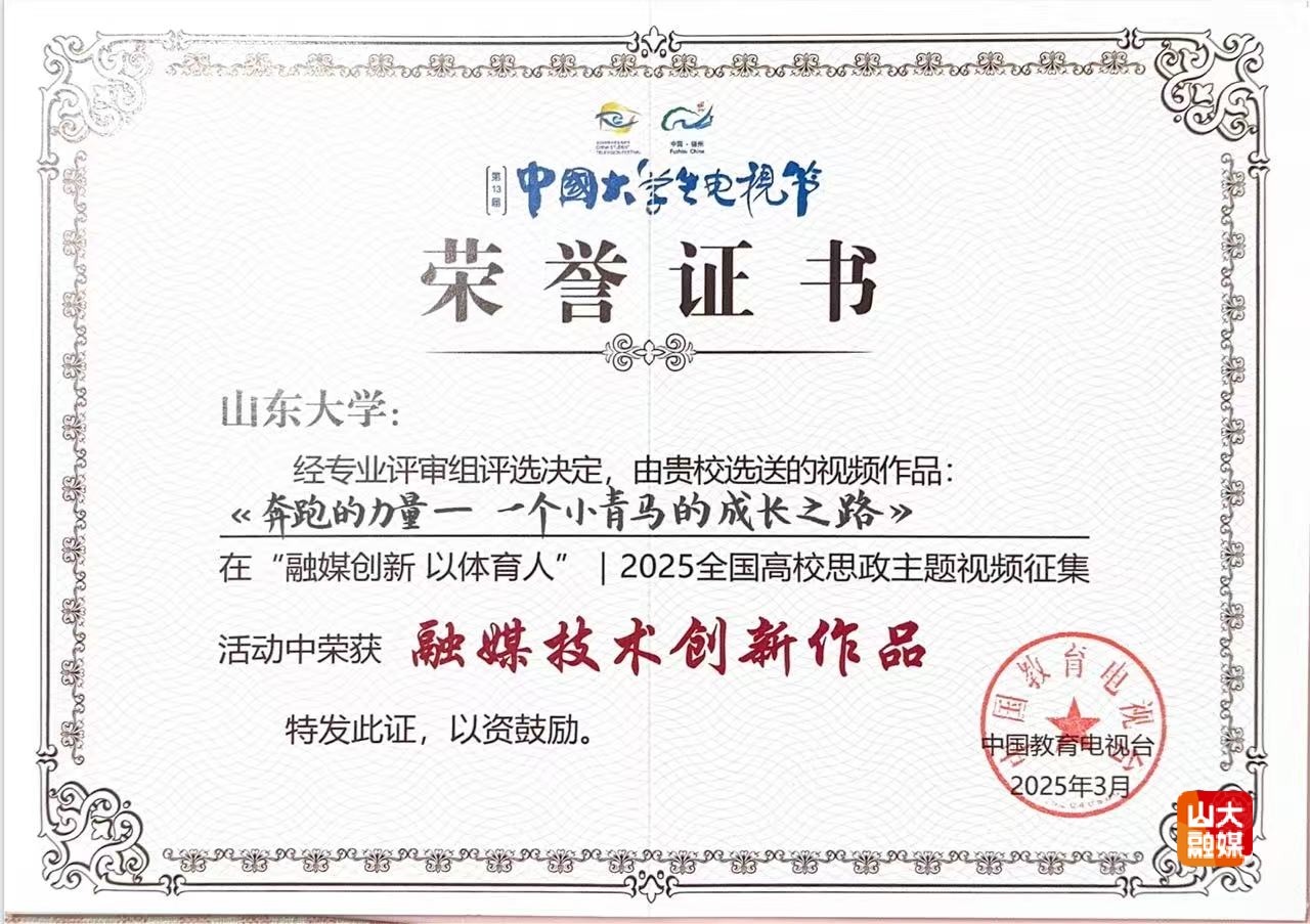 3月23日,在第十三届中国大学生电视节"高校思政创新发展主题活动"中,WilliamHill威廉希尔创作的视频作品《奔跑的力量——一个小青马的成长之路》荣获"融媒技术创新作品奖"。该片以学院马克思主义理论专业2022级本科生孟繁冰的成长故事为主要内容,生动展现马院学子将体育精神与理想信念相融合的成长历程。