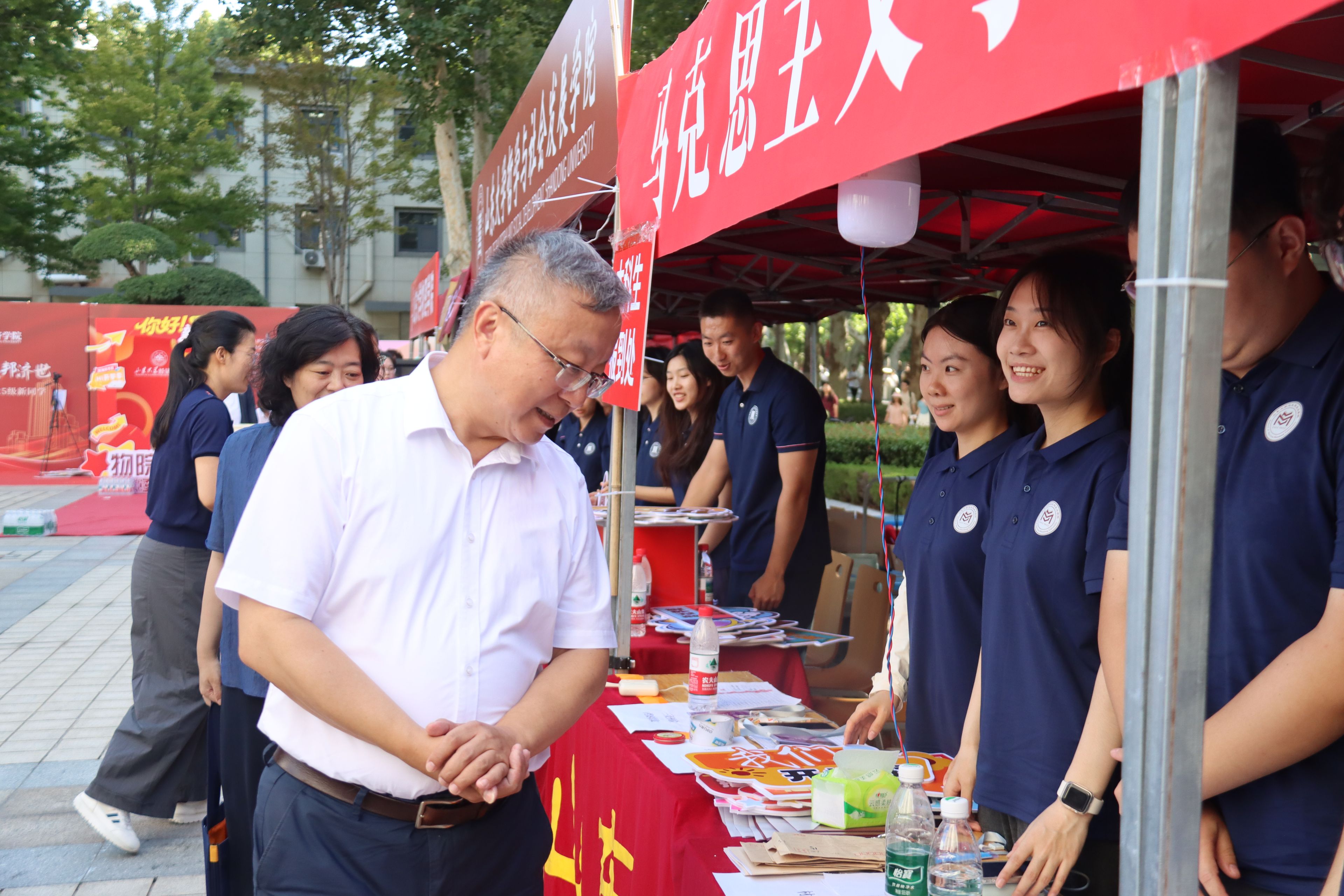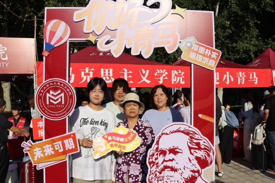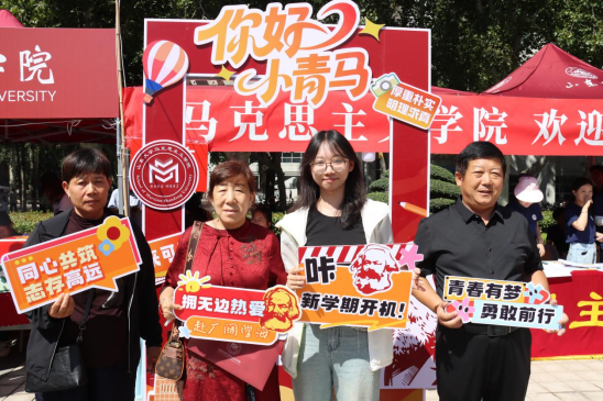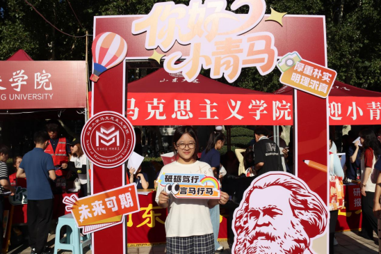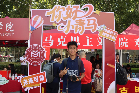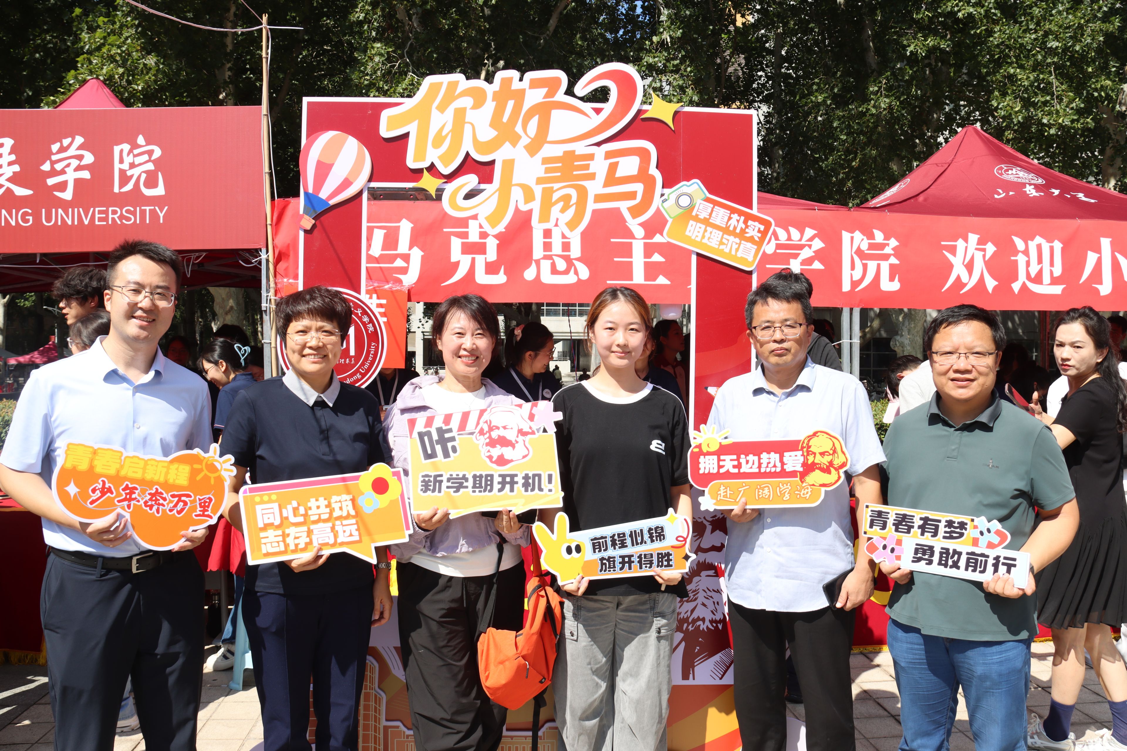 从新生返校前的充分准备到现场报到的精准服务,学院充分发挥线上联络群组作用,组织学生骨干、志愿者全程陪伴,及时传达报到安排,积极回应同学关切。为迎接新生到来,学院还精心准备了别具匠心的文化礼遇。迎新志愿者们手持富有创意的标语横幅和文化展板,并为小青马们送上充满学院特色的原创设计礼包,让每一位初入校园的新生都能感受到山大马院大家庭的青春活力和温暖关怀。