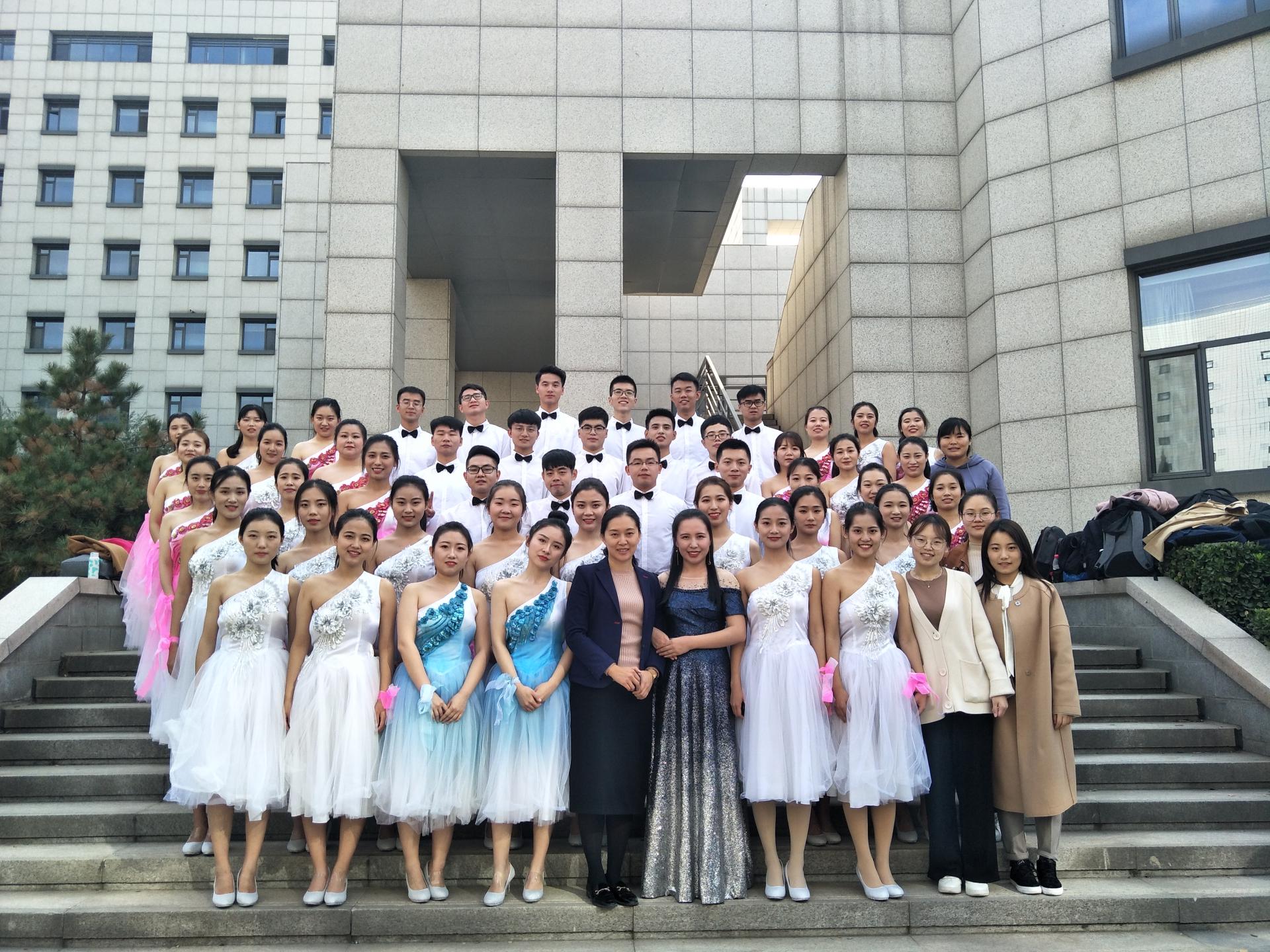 振奋精神,一鼓作气。11月3日上午十点,大家提前来到学院402教室进行比赛前最后的练声和化妆准备。下午一点半,我院合唱团作为第二支参赛队伍整齐出场,舞台上女生们身着礼服,自信优雅;男生们一身西装,风华正茂。在高亢的领唱和热情的指挥下,在男女生悦耳的和声中,同学们用饱含深情的歌声表达着对祖国的热爱和内心自豪,“我爱你中国,亲爱的母亲,我为你流泪,也为你自豪”,琅琅圆润的合唱响起,饱满热烈的情感抒发和娴熟的动作设计把现场氛围推向了高潮,获得了评委和观众的热烈掌声。