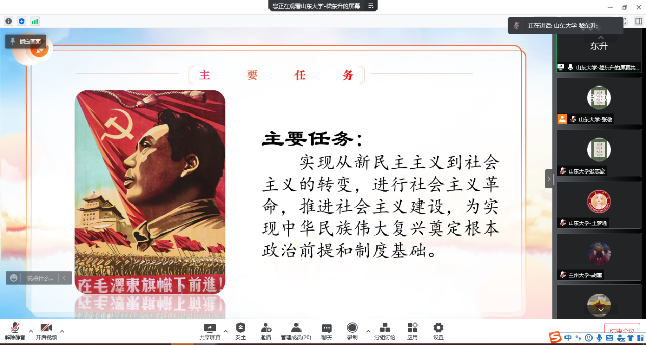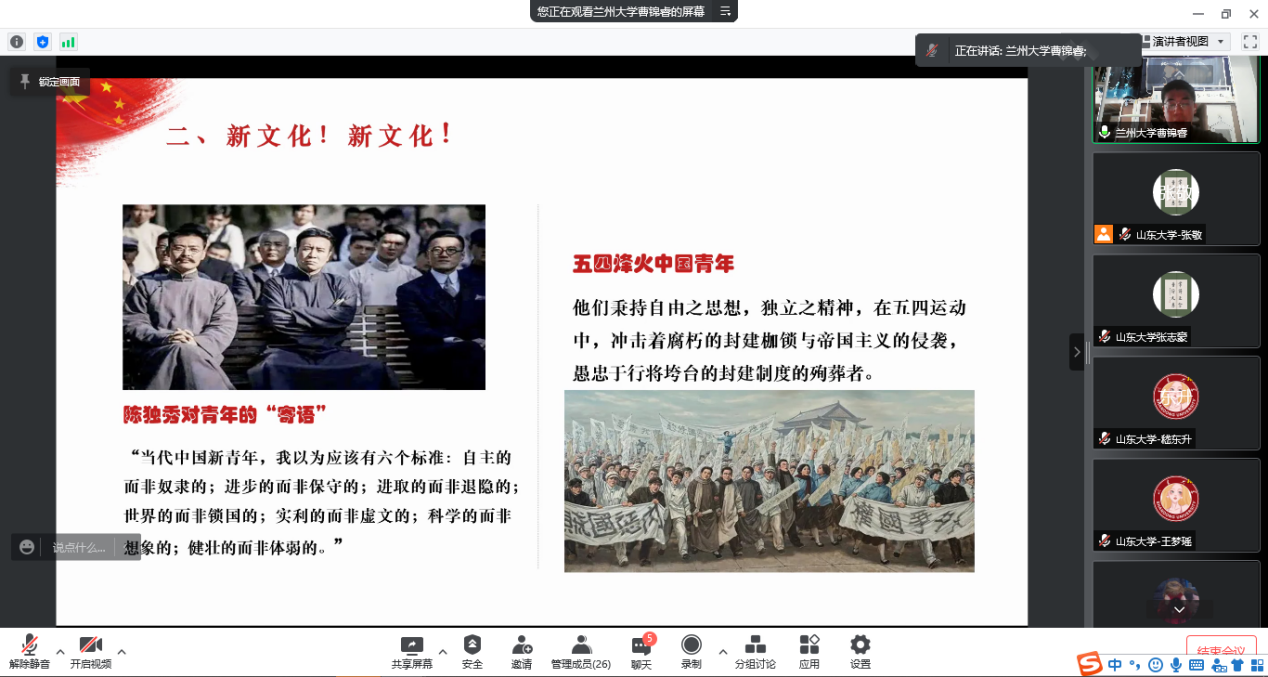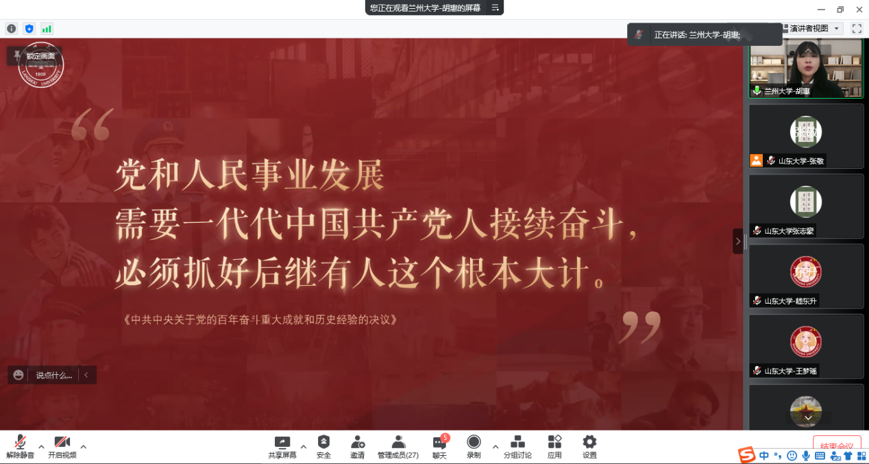 高校理论宣讲团“砥砺奋进新征程•青春献礼二十大”主题接力宣讲第五篇章:“中国共产党百年奋斗的伟大成就”于3月26日上午顺利举行,此次宣讲采用腾讯会议的形式,由williamhill中文习近平新时代中国特色社会主义思想青年学习会(以下简称“习习会”)宣讲团与兰州大学“青马工程”大学生骨干理论宣讲团主讲,多所高校青年学生积极参与。活动由williamhill中文“习习会”青年宣讲团成员张敬主持。