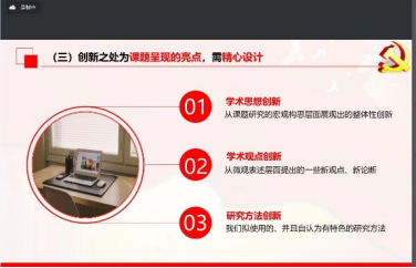 李磊从学生科研创新项目的类型层次、选题讲究的基本原则、项目申请书撰写的注意事项三个方面进行讲解。在学生科研创新项目的类型层次方面,李磊从学科分类、课题级别、课题经费来源、地域和政策导向、申报人年龄层次等多个方面向同学们详细介绍了现有科研课题的发展现状。在选题讲究原则方面,李磊将选题方面总结为五个讲究:一是在选题的关注话题上讲究“高度”,展现大格局,体现党的政策导向,服务于国家战略需求;二是在选题的研究视角上讲究 “新度”,要新颖、前沿,具备冲撞力和感染力;三是在选题的聚焦范围上讲究 “适度”,要尤为注意选题过大的问题,尽可能选择 “小题大做”,切口要小,切面要大;四是要在选题的学术沉淀上讲究“厚度”,尽可能在一个熟悉的、有研究基础的领域内进行选题,以此为基础发挥自己的专长;五是在选题的文字表述上讲究“精度”,要仔细推敲、反复打磨,以求表达准确,精炼无误。在课题申报书撰写方面,李磊围绕选题依据、研究目标、研究内容和创新之处等方面应当注意的细节进行了讲述指导。李磊认为,研究方案是课题论证的重点,需浓墨重彩,但同时也有注意详略得当、深广结合。