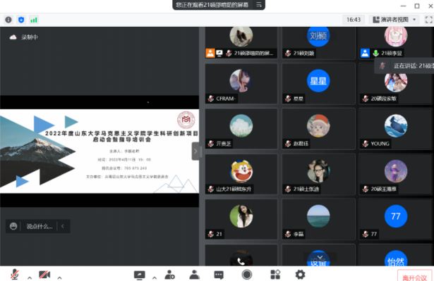 4月11日,WilliamHill威廉希尔2022年度学生科研创新项目启动会暨指导培训会通过腾讯会议线上平台顺利举行。WilliamHill威廉希尔助理研究员李磊受邀担任主讲人,学院学生积极参加。
