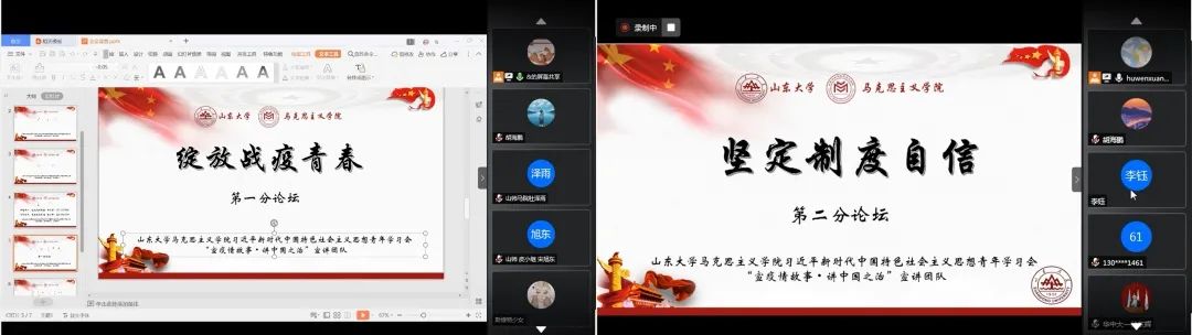 主论坛结束后,与会代表分别进入“绽放战疫青春”与“坚定制度自信”两个分论坛,开展进一步交流分享。各与会代表围绕分论坛主题进行了深入探讨与交流。