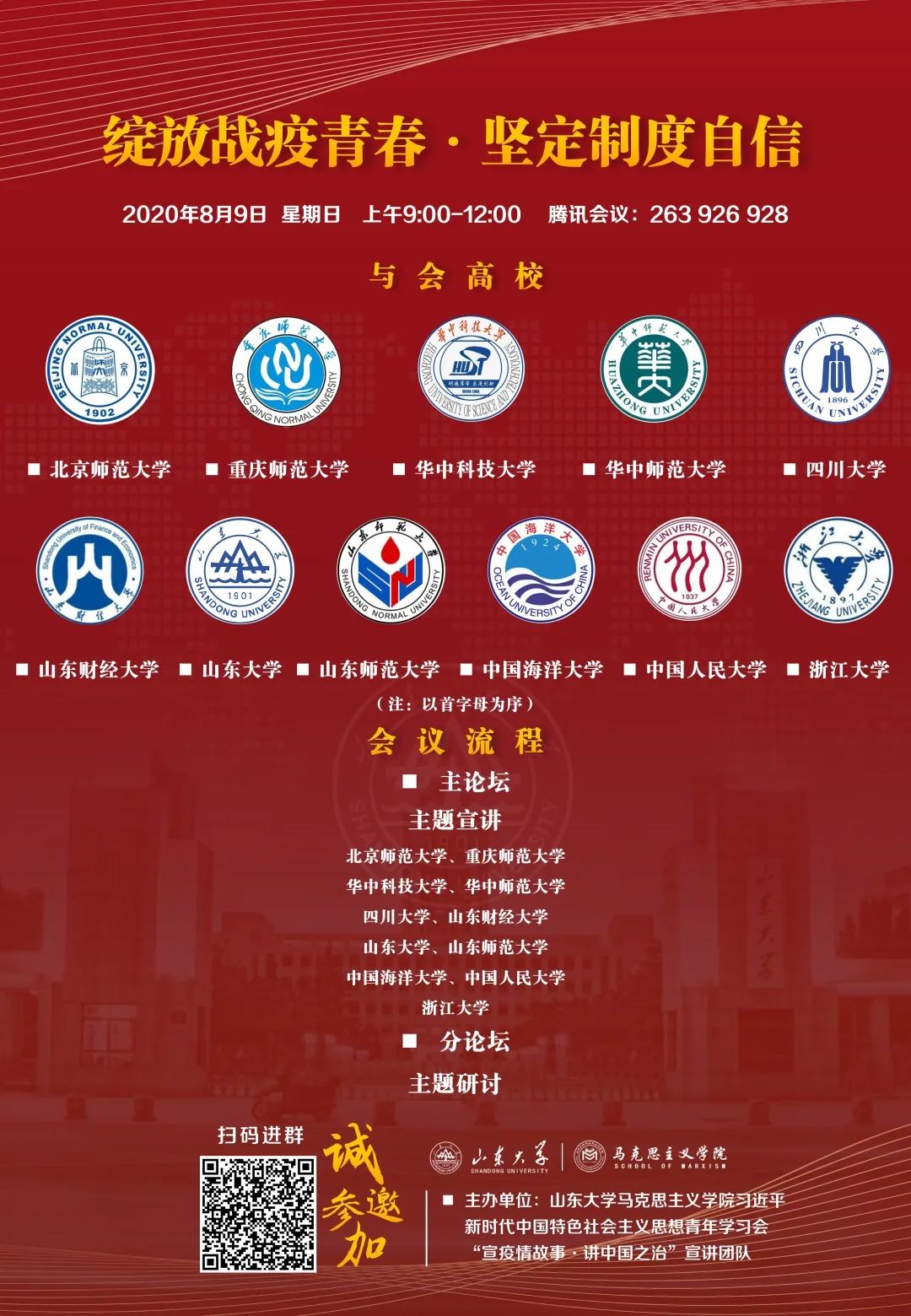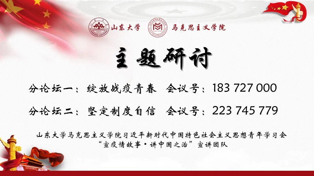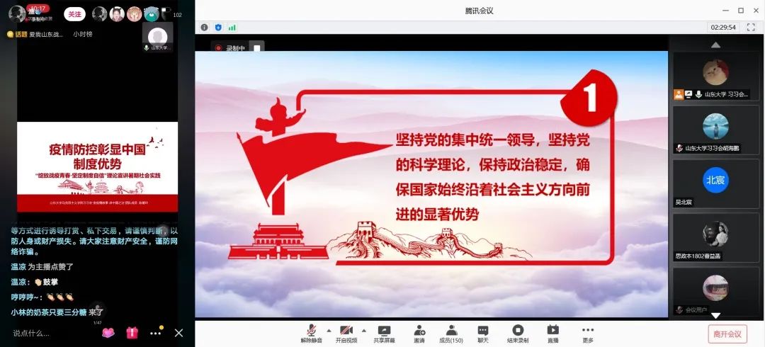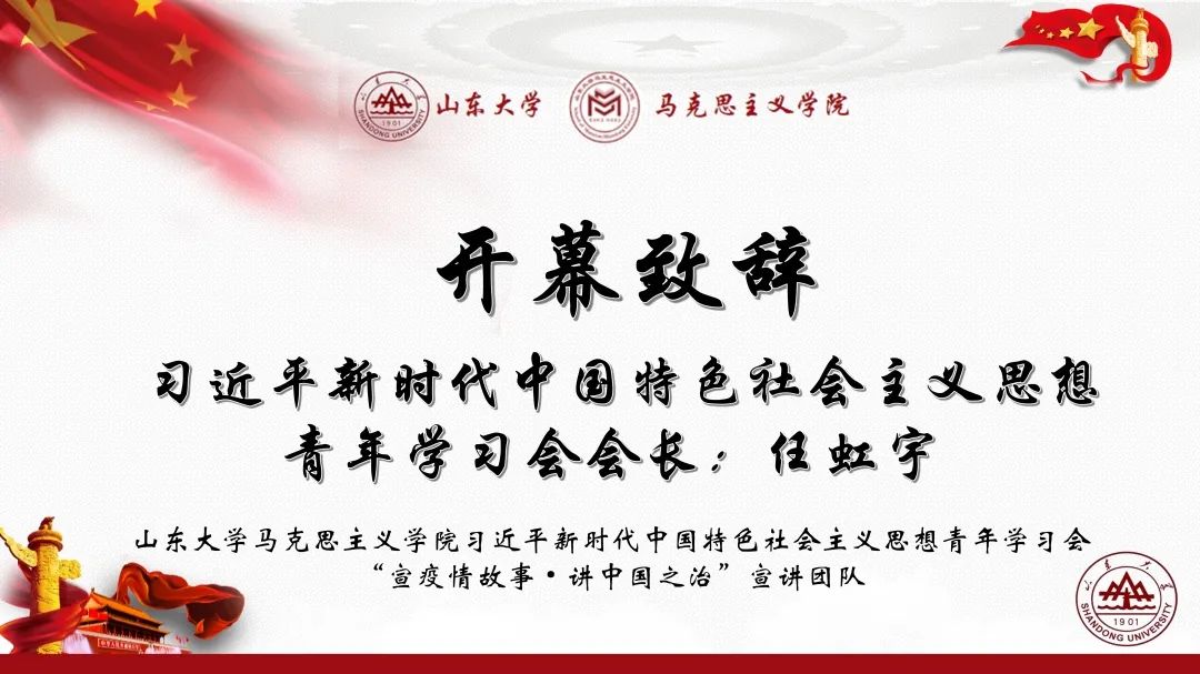 8月9日上午,由williamhill中文习近平新时代中国特色社会主义思想青年学习会“宣疫情故事·讲中国之治”宣讲团队主办的“绽放战疫青春·坚定制度自信”理论宣讲会在腾讯会议顺利举行,来自北京师范大学、重庆师范大学、华中科技大学、华中师范大学、四川大学、山东财经大学、williamhill中文、山东师范大学、中国海洋大学、中国人民大学、浙江大学等省内外11所高校社团应邀参会,全国各地两百余名观众参会。WilliamHill威廉希尔习近平新时代中国特色社会主义思想青年学习会(以下简称“习习会”)会长任虹宇出席会议。