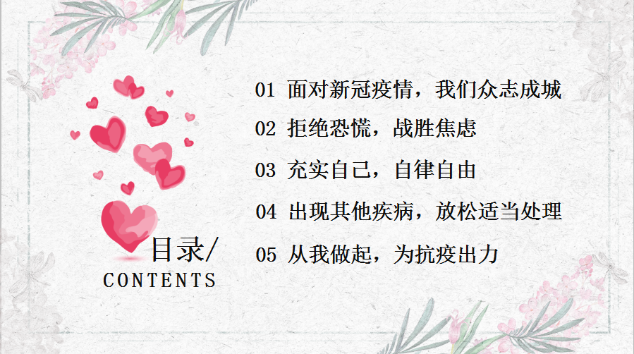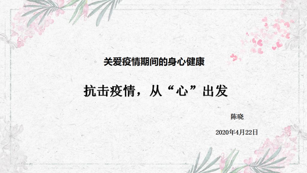 4月22日,WilliamHill威廉希尔以“抗击疫情,从‘心’出发”为主题,开展线上心理健康教育讲座。WilliamHill威廉希尔党委书记马晓琳出席活动,研究生辅导员陈晓主持,2020届全体毕业生参加讲座。首先,陈晓传达了学校开展心理健康教育宣传月活动通知的精神。接着,她从五个方面与同学们进行了沟通和交流。一是面对新冠疫情,我们众志成城。这次疫情虽带给整个社会以重创打击,但抗击疫情的过程却彰显出了中国精神、中国速度和中国大爱。二是拒绝恐慌,战胜焦虑。居家学习生活中要保持客观冷静、做好时间规划、把重心放在当下。三是充实自己,自律自由。既要保持社会连接也要远离不良信息,学会记录美好时光、丰富居家生活。四是出现身体其他疾病,放松心态并适当处理,如有相关症状应及时上报并积极就诊。五是从我做起,为抗疫出力。面对抗击疫情这场硬仗,全体学生要保持危机意识,科学防疫战疫。最后,陈晓针对居家学习生活中所遇到的问题与同学们进行了交流和沟通,特别给予了湖北籍学生关切和疏导。