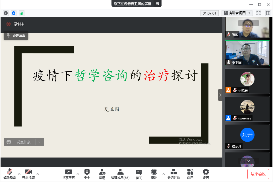 专家报告环节,刘海江老师介绍了自己作为山东省赴英国联合工作组成员赴英开展工作的经历,并用“1314”“520”“525”三个数字分享了自身的心得体会。刘海江表示,我国在防控疫情的过程中,始终把人民生命安全和身体健康放在第一位,在做好国内疫情防控工作的同时,力所能及地帮助其他国家抗击疫情,充分展示了大国的担当。他对青年大学生提出五点建议:要有战而胜之的信心,“恢弘志士之气”;要聚焦主业不动摇,“无专精则不能成”;要学会状态维系,“千钧将一羽,轻重在平衡”;要学会寻求帮助,“彼此挹灵芬”;要学会适量运动,“动则不衰,用则不退”。夏卫国阐述了疫情防控中开展哲学咨询治疗的意义,并从哲学咨询与心理咨询的差异、案例分析、概念描述、方法理路等方面对哲学咨询进行了介绍,建议大家正确对待疫情中出现的心理问题,树立正确的防控意识。当面临心理方面的难题时,可以积极学习包括哲学在内的多元知识,培育交叉思维和多样化思考能力,开阔研究、打开心胸,尝试培养自己的整全性思维。他建议大学生要关注自身、善待自己,学会寻求支持,必要时可以积极寻求心理咨询师和思想政治工作者的帮助。