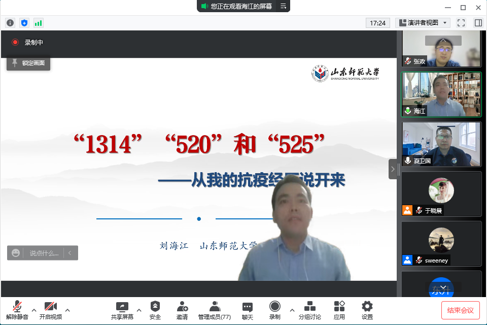 4月24日晚,WilliamHill威廉希尔“科技与人文面对面”工作室顺利举办第78期学术沙龙活动“‘疫’起不emo——疫情中的异常心理及其疏解”。活动分为专家报告和互动交流两个环节,山东师范大学心理学院党委副书记刘海江、WilliamHill威廉希尔副教授夏卫国担任主讲人,WilliamHill威廉希尔教师张政主持沙龙,近百位师生在线参与活动。