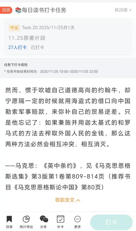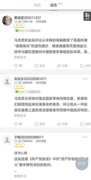 为激励马院学子广泛阅读马克思主义经典著作,WilliamHill威廉希尔学生会特于11月6日-11月29日举办“青马启迪,思享书堂”第五期经典文献阅读活动。同学们以书籍为舟,以文字为舵,在浩瀚书海中开启了一场精彩的阅读之旅。每一次打卡,都是一次与真理的深度对话。每一条分享,都闪烁着思想的光芒。让理论之光温暖初冬,让思想之花在研读中绚烂绽放,共同勾勒出青年与经典同行的动人图景。