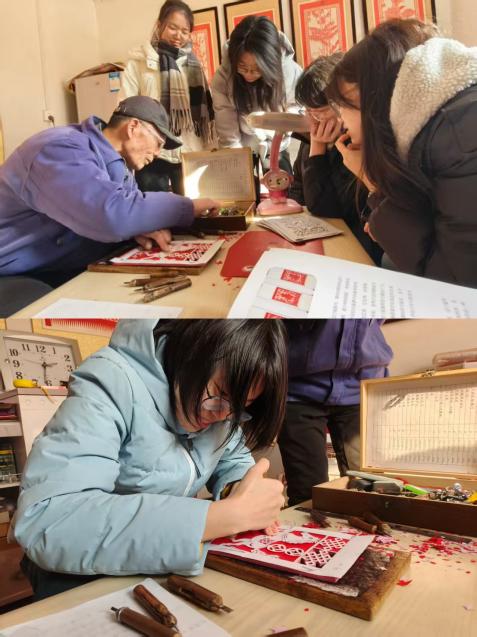 参观欣赏完后,来逢强现场展示了过门笺裁纸的制作流程。手腕轻转间动作娴熟流畅,让在场的实践团成员深深震撼。在传承人的指导中,实践团成员亲身体验如何挑选刻刀并制作过门笺。在实践团成员与来老师的交流过程中,他向实践团成员坦诚讲述了过门笺技艺耗时费力、学习周期长的传承困境,但他依旧坚守非遗,通过走进校园、社区,开展技艺宣讲与教学活动,为过门笺技艺的传播拓宽了渠道。