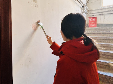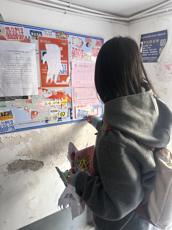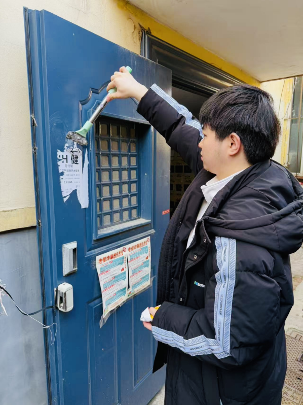 培训结束后,志愿者们迅速集结,带着清洁工具奔赴社区各区域。面对楼道里层层叠叠的小广告,大家耐心铲除、清理胶印,不放过一处死角;针对路面和绿化带内的垃圾,弯腰捡拾、分类清运。数小时下来,社区环境焕然一新,楼道整洁有序,路面干净清爽。同学们不怕脏、不怕累,以饱满热情和务实作风投入服务,赢得了社区工作人员和居民的一致认可。