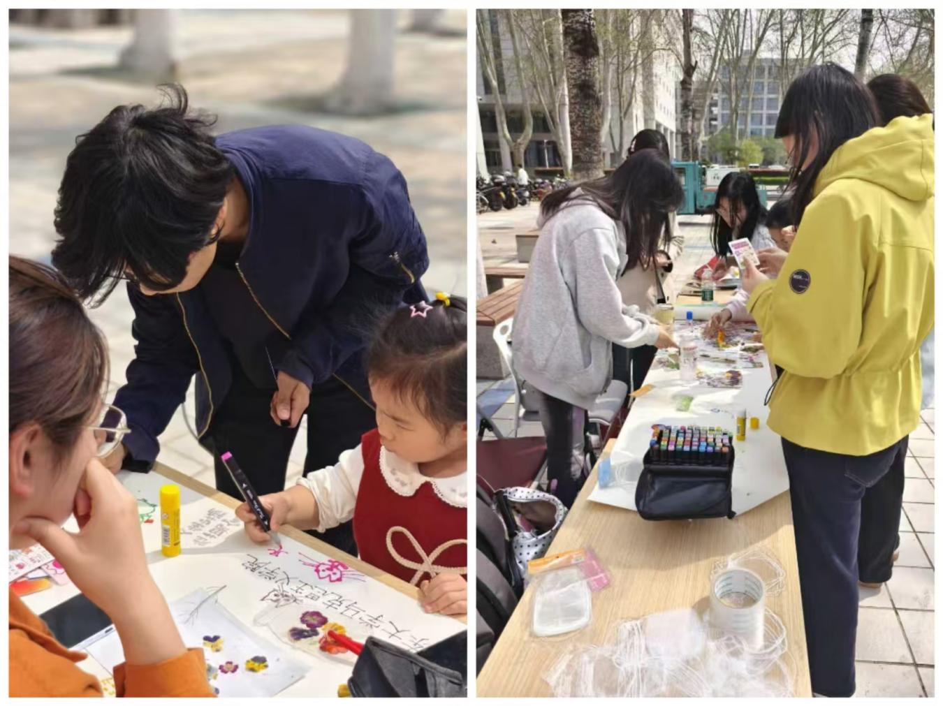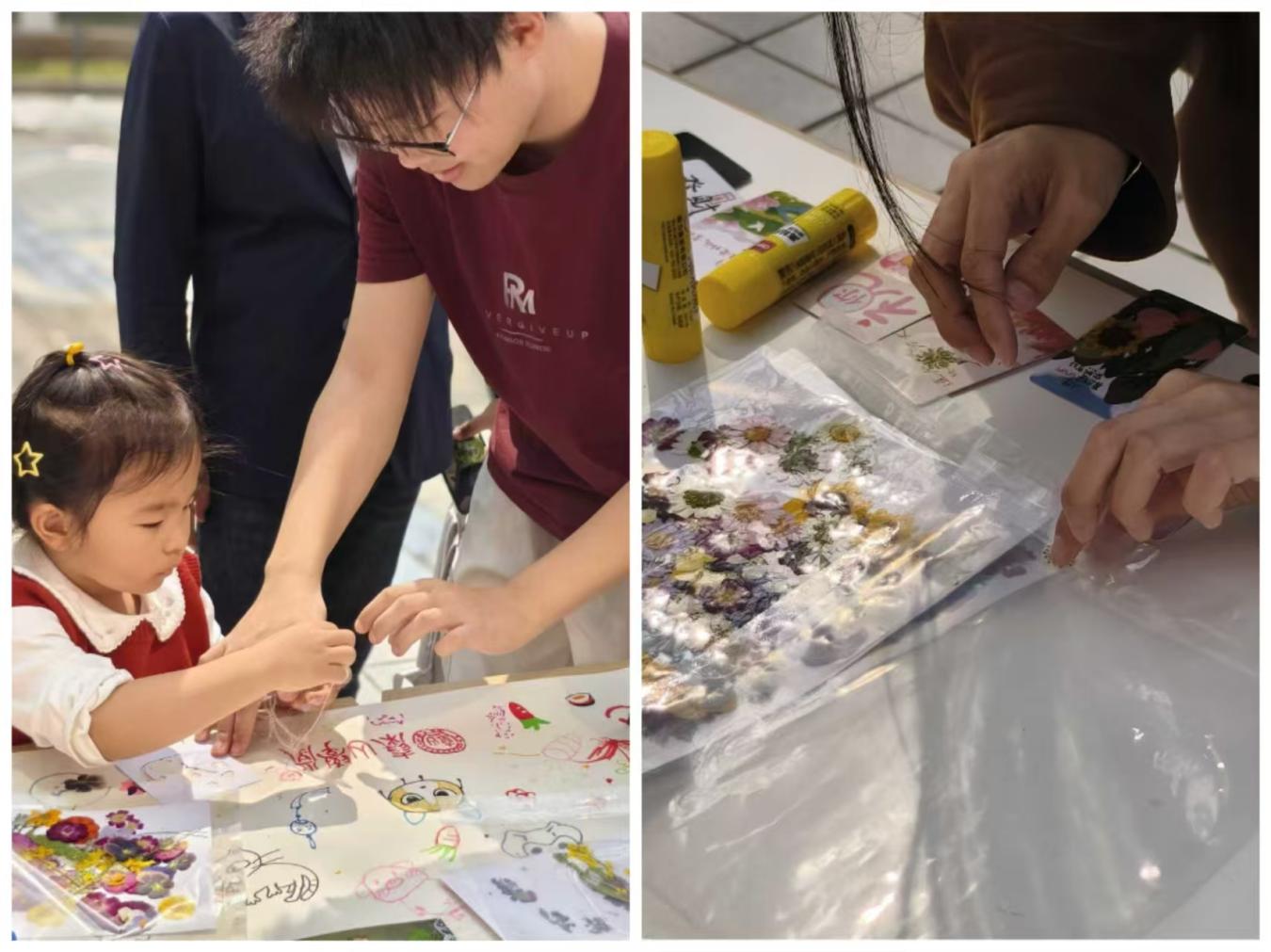 春风润心,向暖而行。本次活动精心设置了“情绪纸飞机”、“DIY压花书签”、“镂空图案打卡”等趣味环节,吸引了众多师生留步参与。在DIY压花书签环节,参与者们在物料包中挑选出喜爱的干花材料,将材料放置书签内,制作独属于自己的清新治愈的书签。这一活动充分调动参与者们的动手积极性,制作的书签具有将春天留住的特殊意义,能够拂去心灵繁杂,温暖、疗愈参与者的精神。