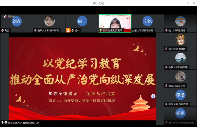 williamhill中文朱荣从理论逻辑、历史逻辑和实践逻辑等方面解读党的二十届三中全会及《决定》的重要意义,旨在阐明党的二十届三中全会“何以召开、何以重要”,激励新时代青年人在全面深化改革的新征程中自信自强,守正创新,踔厉奋发、勇毅前行。中国人民大学张昊以中华优秀传统文化的创造性转化、创新性发展这一核心命题为关键,从梳理提出过程,明确具体内涵、把握丰富成果、着眼未来实践十个方面,对这一命题进行宏观把握和细致分析。中国人民大学楚润东介绍了习近平总书记关于党的自我革命重要思想的主要来源,从中国共产党为什么自我革命、为什么能自我革命、怎样推进自我革命三个维度讲述这一思想成果的核心要义,最后联系实际,为新时代学生党员如何提升党性修养提供思考。清华大学刘雨濛以《毛泽东选集》中的重要文本为依托,系统讲解中国共产党革命史,旨在帮助大家理解中国特色革命道路理论与实践的重要意义。南京大学厉清雯从新质生产力在经济生产中的生动实践出发,理论与实践结合,梳理新质生产力理论,坚定道路自信、理论自信,共同绘就新时代全新的发展画卷。吉林大学宁新杰带领我们回顾党的纪律建设的演进历程,这不仅能提高我们对党纪学习教育历史纵深的认识,也能增强对新修订《中国共产党纪律处分条例》的领会和力行。西安交通大学曹瑞通过揭示中国共产党自成立以来始终保持“组织严密、纪律严明”优良传统的历史启示,结合现实案例进一步强调“加强纪律建设、全面从严治党”的重大意义,阐释青年党员与全面从严治党的紧密联系,进一步从青年视角提出将党纪学习“学在先、悟在深、践在实”的内在要求,在未来新时代的历史征程中做勇于自我革命、敢于担当作为的时代新人。