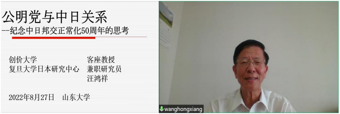 今年适值中日邦交正常化50周年,日本创价大学客座教授、复旦大学日本研究中心兼职研究员汪鸿祥教授以《公明党与中日关系——纪念中日邦交正常化50周年的思考》为题,主要介绍了美苏冷战背景下公明党对华政策的形成和中日邦交正常化的历史脉络,他结合新冠疫情国际大背景,详细叙述了中日关系的变动与公明党在其中发挥的重要作用。最后汪教授指出,着眼未来,“竞合共生”是新时代中日关系的新常态,两国应通过加强民间交流,保持相互信赖、和平友好的双边关系,进一步推动中日关系的改善和发展,谋求中日两国之间的互惠共赢。汪教授在课程中同全体师生展开了热烈交流,他以专业学术知识和个人亲身体会相结合,耐心、细致地回答了线上同学的问题,为全体师生带来了一场丰富的学术大餐。