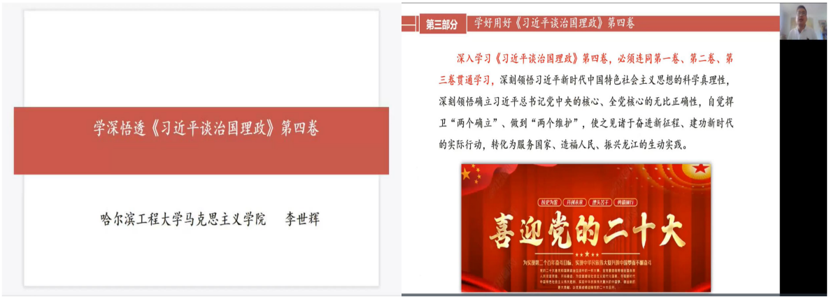 专题讲座中,李世辉教授以学深悟透《习近平谈治国理政》第四卷为题,深刻阐释了《习近平谈治国理政》第四卷的历史地位、重大意义、精神实质、核心要义、丰富内涵和实践要求。整个报告语言生动、分析透彻、内涵丰富、引人入胜,让全体师生对《习近平谈治国理政》第四卷蕴含的真理力量和实践伟力有了更加深刻的理解,对展现的历史自信和责任担当有了更加全面的认识。