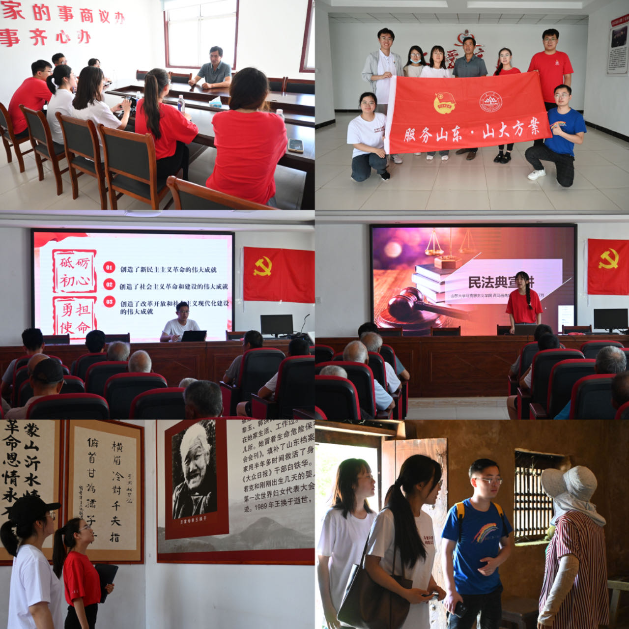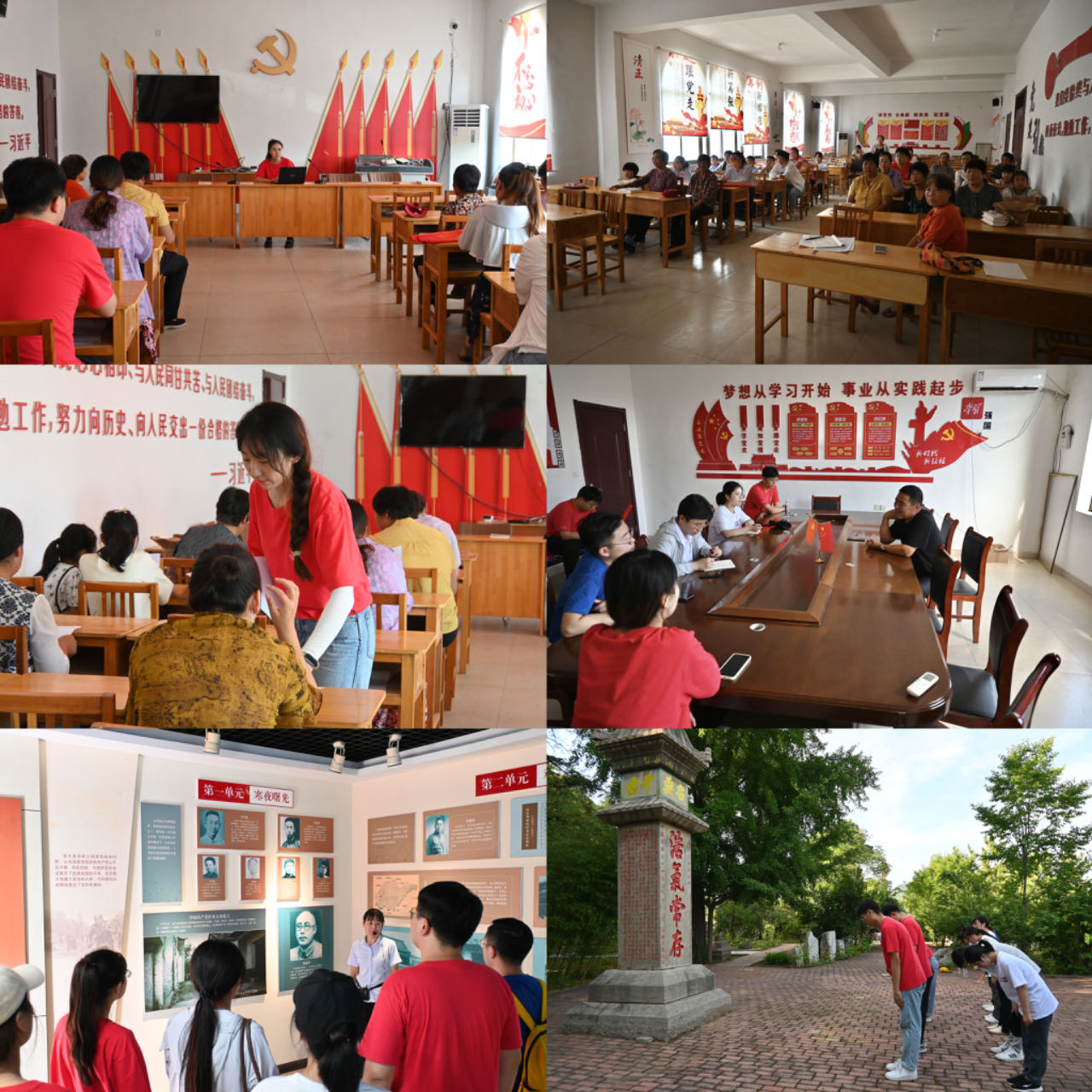在沂水县夏蔚镇王庄村,团队成员来到党群服务中心,邀请当地村民参与,拿出具体事例生动形象地向村民作了题为《没有全面的小康,就没有真正的小康》的宣讲,并通过问卷调查的形式进一步了解革命老区基层党组织思想引领力发挥实效。同时,成员们与王庄村党支部书记龚培建深度交流,从第一书记帮扶、红色旅游资源开发、樱桃种植宣传推广等各个方面了解王庄村在脱贫攻坚及乡村建设道路上的经验与现状。访谈过后,团队成员在讲解员的引导下来到中共中央山东分局旧址、《大众日报》旧址、八路军山东纵队成立地进行参观学习,在古朴静谧的旧址中,通过讲解员的口述,这段波澜壮阔的历史又呈现在成员们的眼前。在王庄烈士陵园,团队成员又进行了一次特殊的入党宣誓,重温入党誓词,缅怀先烈丰功伟绩,在瞻仰中学习前辈们为党的事业不懈奋斗的牺牲精神以及真挚深厚的为民情怀。