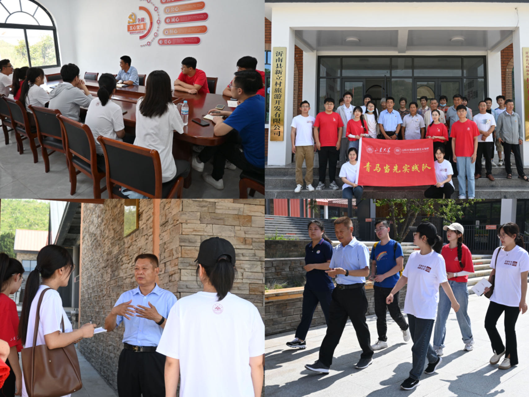 实践队和服务团成员首先来到了沂南县马牧池乡新立村,与党支部书记王本来进行了深入交流。受沂蒙山区区域位置条件制约,新立村一度十分贫穷落后,近年来新立村不断创新,以“美丽乡村建设”为契机,将沂蒙山自然资源转为优势,同时依托苹果种植经验,在乡党委的帮助下建立村企共建模式,真正将新立村建设为“美丽乡村·心里老家”。随后,调研团成员在工作人员的带领下参观了马牧池乡沂蒙红色研学营地,体验了营地内包括红色教育主题在内的多个门类课程,感受到了沂南县地方对红色资源尤其是红嫂精神的高度重视和深度开发。