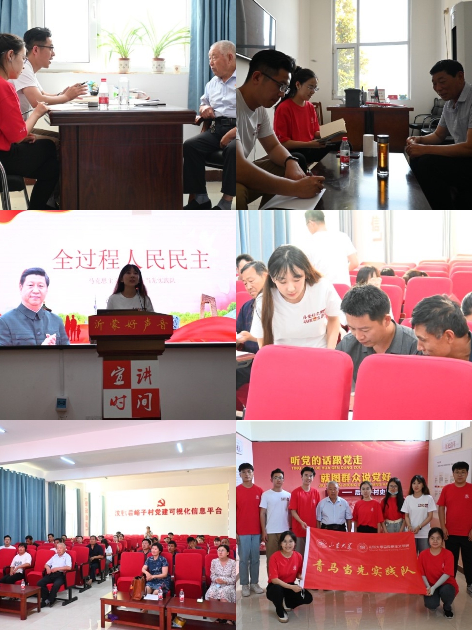 在沂南县后峪子村,团队成员与老支书梁兆利、现任村支部书记梁兆钧进行访谈,参观村史馆,面向村民进行理论宣讲,并通过发放、填写问卷进一步了解革命老区基层党组织思想引领力所发挥的实效。走进后峪子村,团队成员首先走访了村内部分场所,在参访了整齐划一的居民楼、现代化的社区服务中心、银行代办点、学校等设施后,团队成员来到后峪子社区党群服务中心,与老支书梁兆利、现任村支部书记梁兆钧进行访谈,详细了解后峪子村脱贫攻坚的发展历程,从党建引领、文化建设、民生工程、产业发展、美丽乡村建设等方面详细了解后峪子村乡村振兴建设的经验举措与当前现状,并在老支书梁兆利的带领下参观了村史馆,做进一步了解。随后,团队成员以《全过程人民民主》为题面向村民进行理论宣讲,从青年话语、乡村视角切入,深入浅出地解读党的最新理论成果。