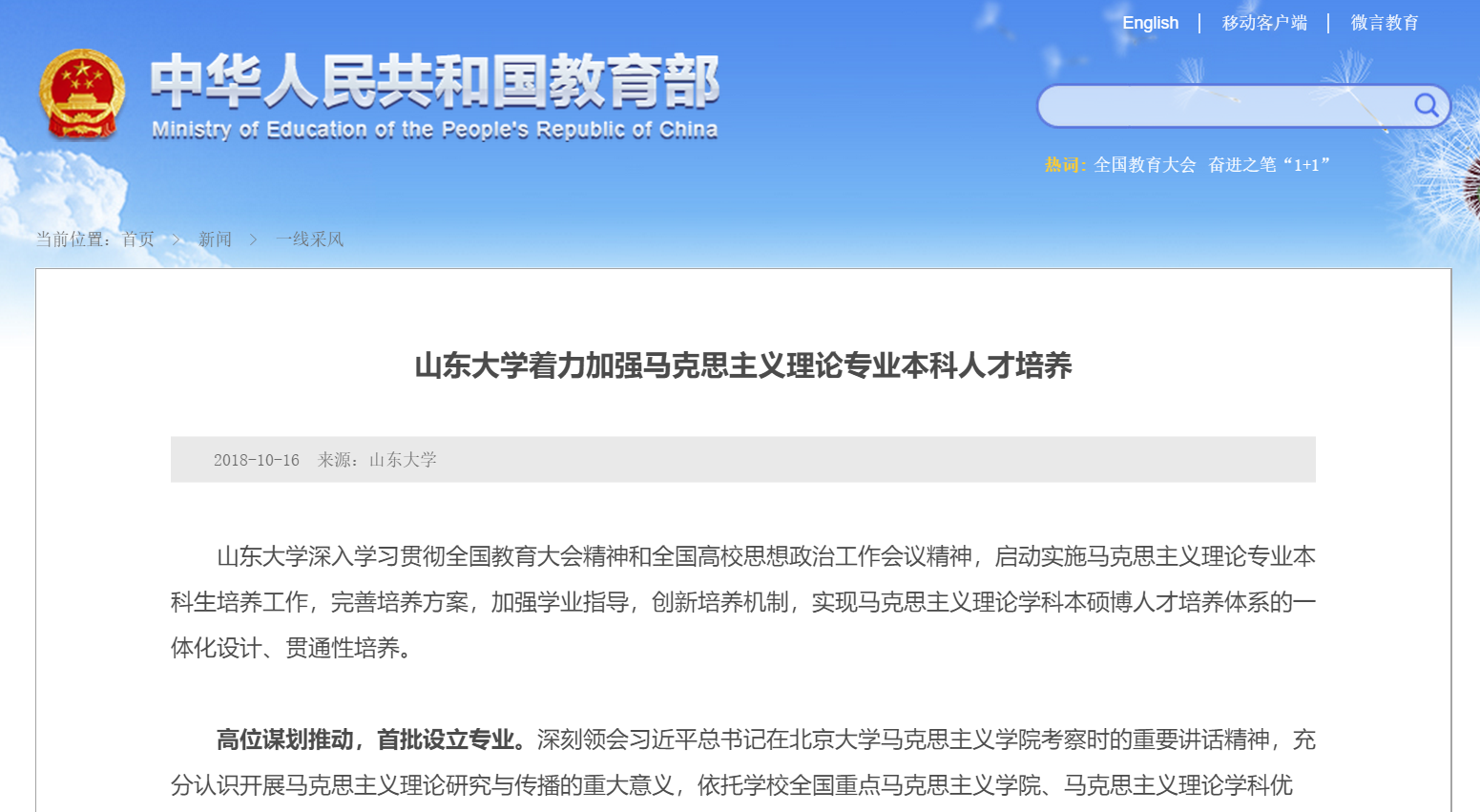 10月16日,教育部官网主页“战线联播”栏目刊发题为《williamhill中文着力马克思主义理论专业本科人才培养》的文章,对我校马克思主义理论本科教育工作进行单篇报道。刊文对我校马克思主义理论专业本科教育教学的工作体制机制进行了详细介绍,这是对我校马克思主义理论本科人才培养工作的充分肯定。今年五四前夕,习近平总书记亲自到北京大学WilliamHill威廉希尔考察,充分体现了党中央对建设WilliamHill威廉希尔的鲜明态度,是进一步擦亮中国...